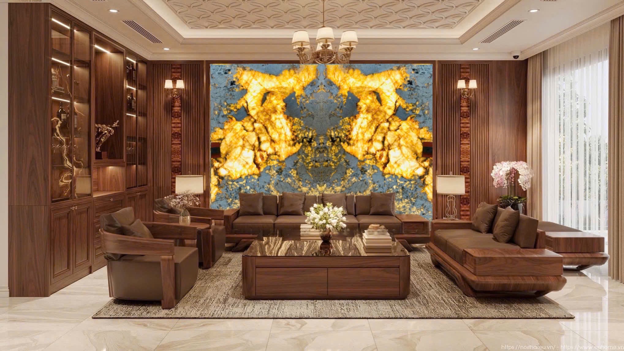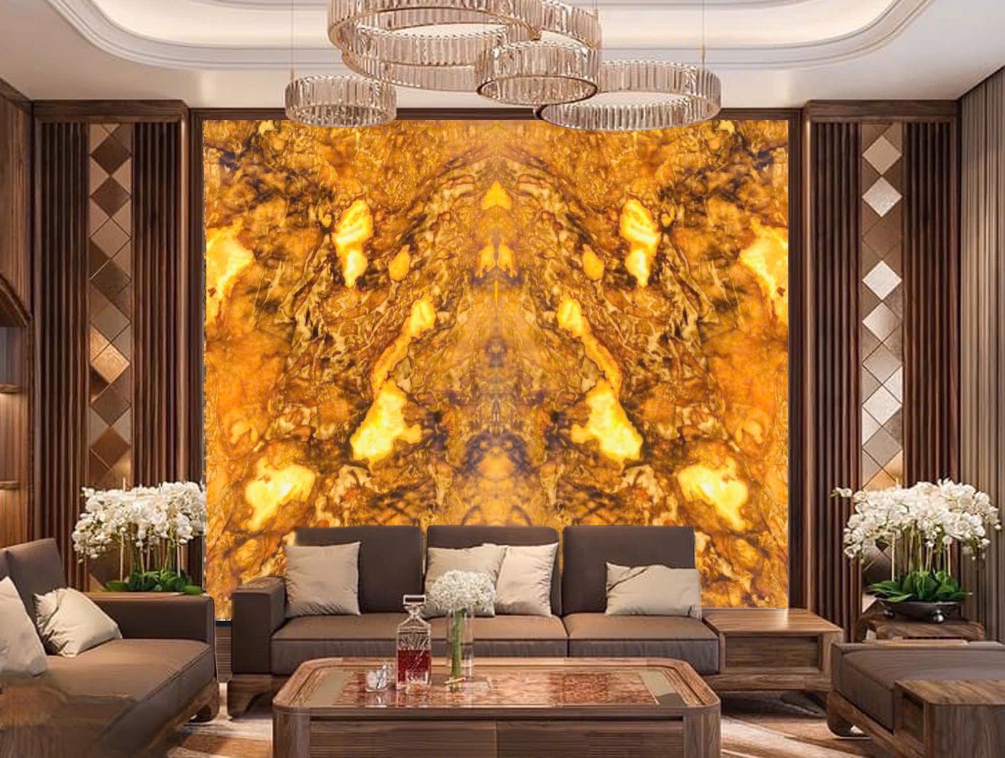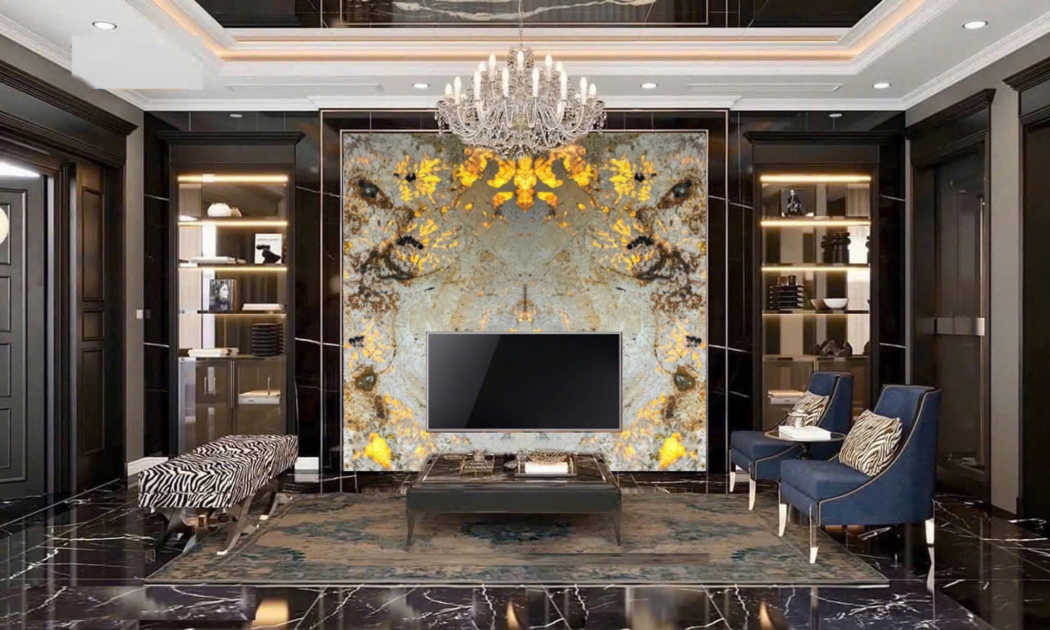Tranh đá đối xứng làm nền sau sofa, sau tivi hoặc toàn bộ mảng tường giúp khẳng định đẳng cấp chủ nhân. Các công trình biệt thự, penthouse, villa đặc biệt yêu thích ứng dụng này.