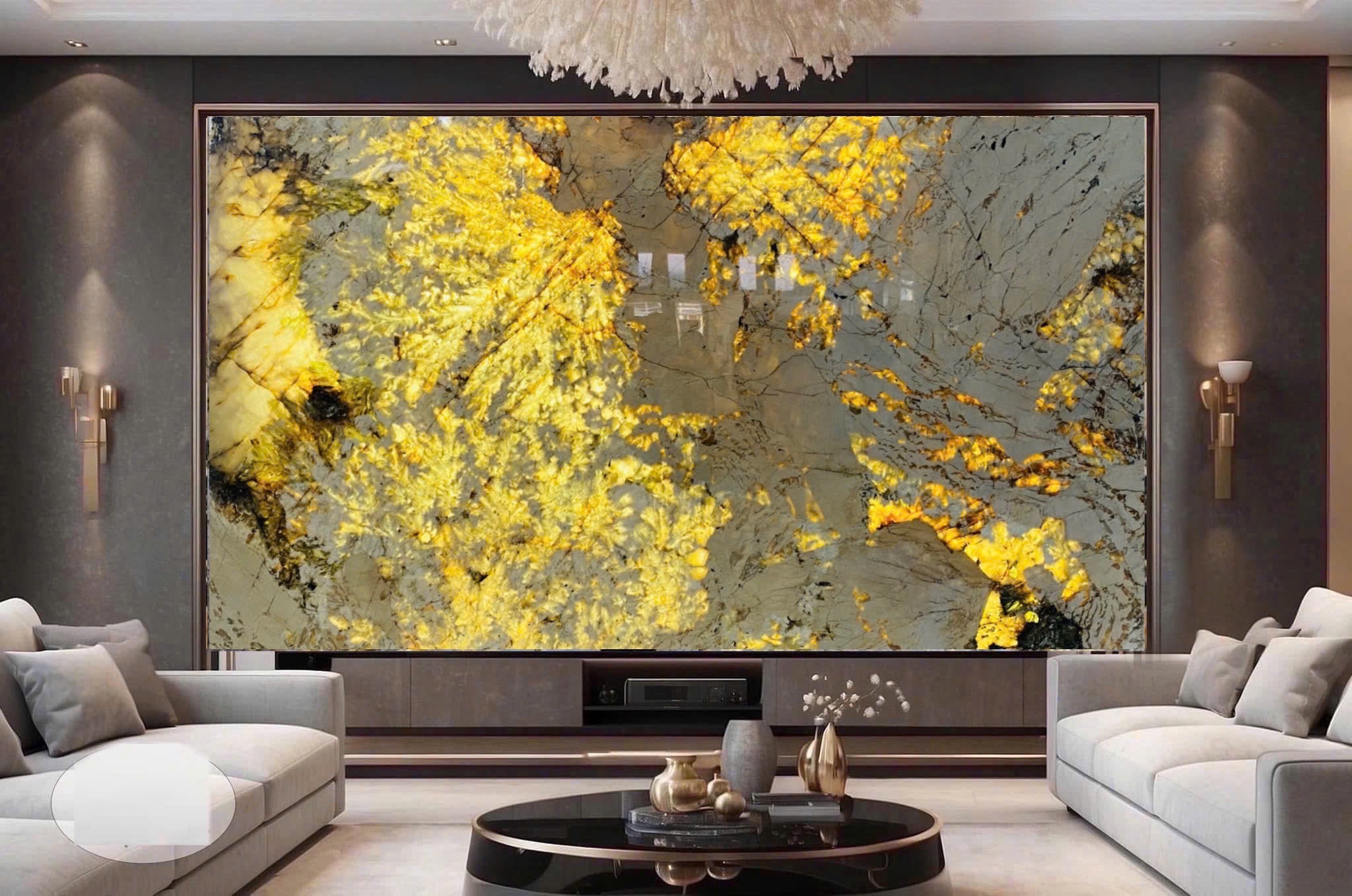 Phòng khách là nơi giao thoa khí vận. Sử dụng tranh đá, tường ốp đá xuyên sáng hay mặt bàn từ đá tự nhiên sẽ giúp không gian thêm sang trọng và cân bằng.