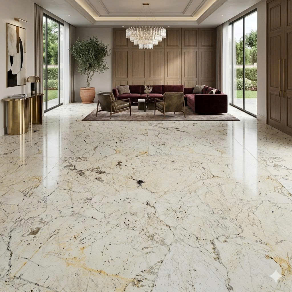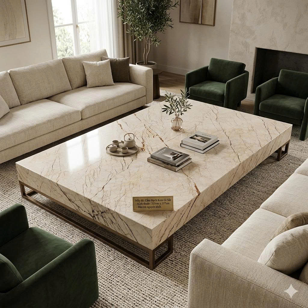 Kiani Crown gây ấn tượng với nền kem sáng sang trọng, điểm xuyết hệ tinh thể thạch anh lớn đan xen tự nhiên tạo hiệu ứng “vương miện đá” độc đáo. Tổng thể mang vẻ đẹp thanh lịch nhưng vẫn đủ cá tính để trở thành điểm nhấn trong không gian.