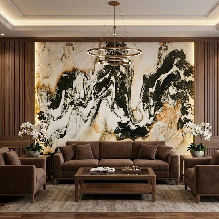 Không chỉ là vật liệu trang trí, tranh đá sơn thủy là một “bức tranh thiên nhiên” sống động được tạo nên từ chính tạo hóa. Những đường vân uốn lượn như núi non – sông nước hòa quyện, mang đến cảm giác bình yên, sang trọng và đầy chiều sâu cho không gian sống.