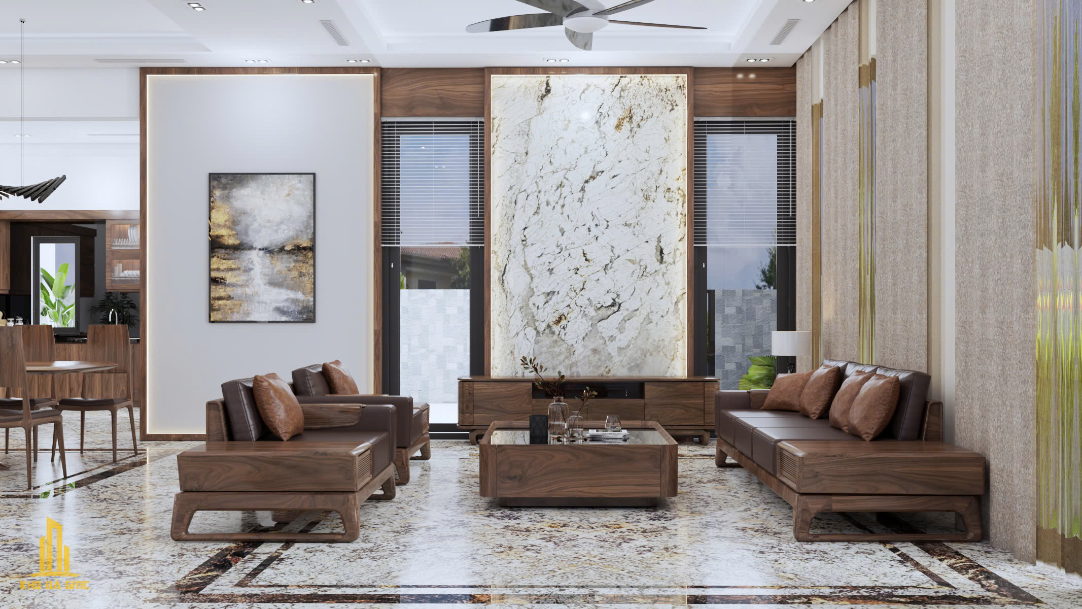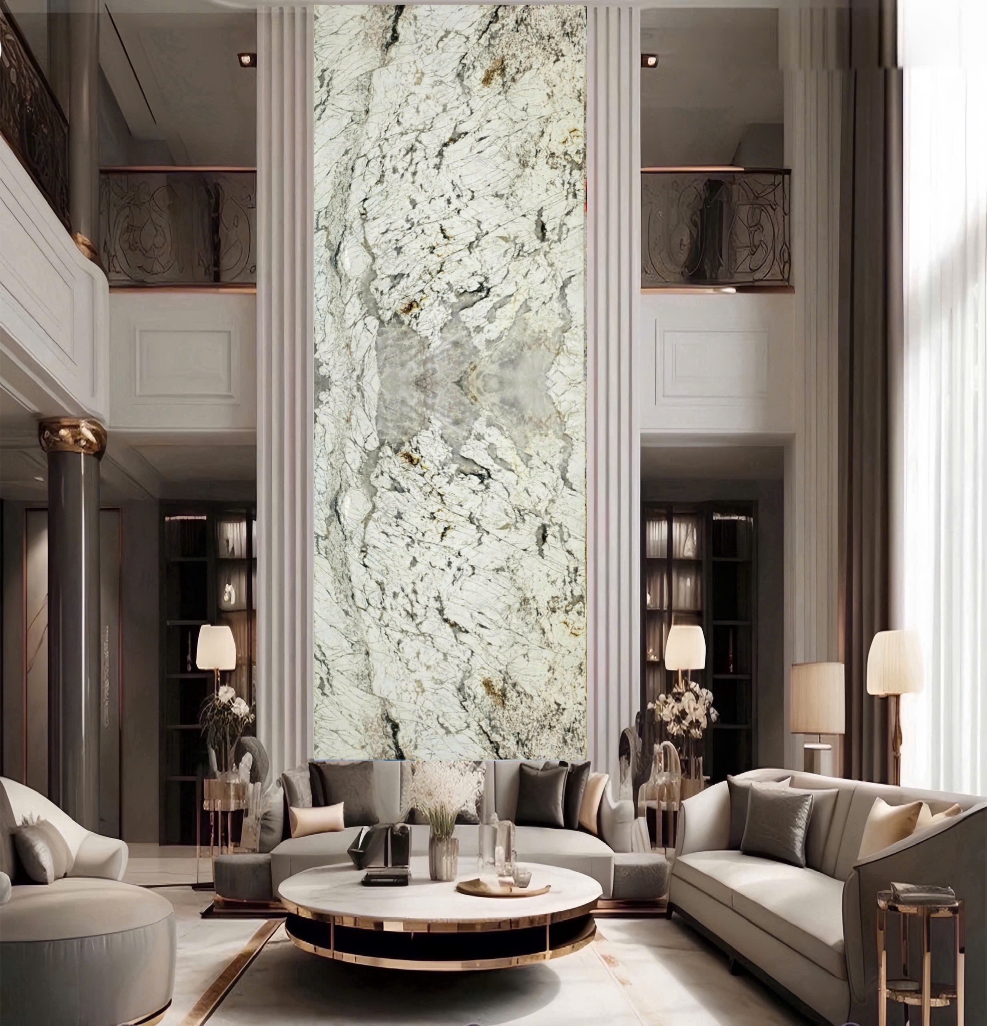 Phòng khách sử dụng Monalisa White mang lại vẻ sang trọng nhẹ nhàng, phù hợp cho những gia chủ thích sự tinh tế và thanh lịch. Ánh sáng chiếu lên bề mặt đá giúp không gian trông rộng và thoáng hơn.
