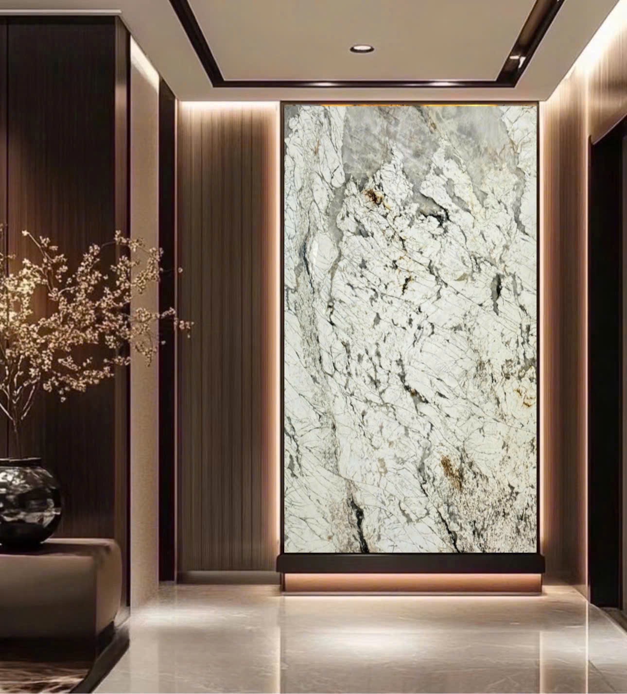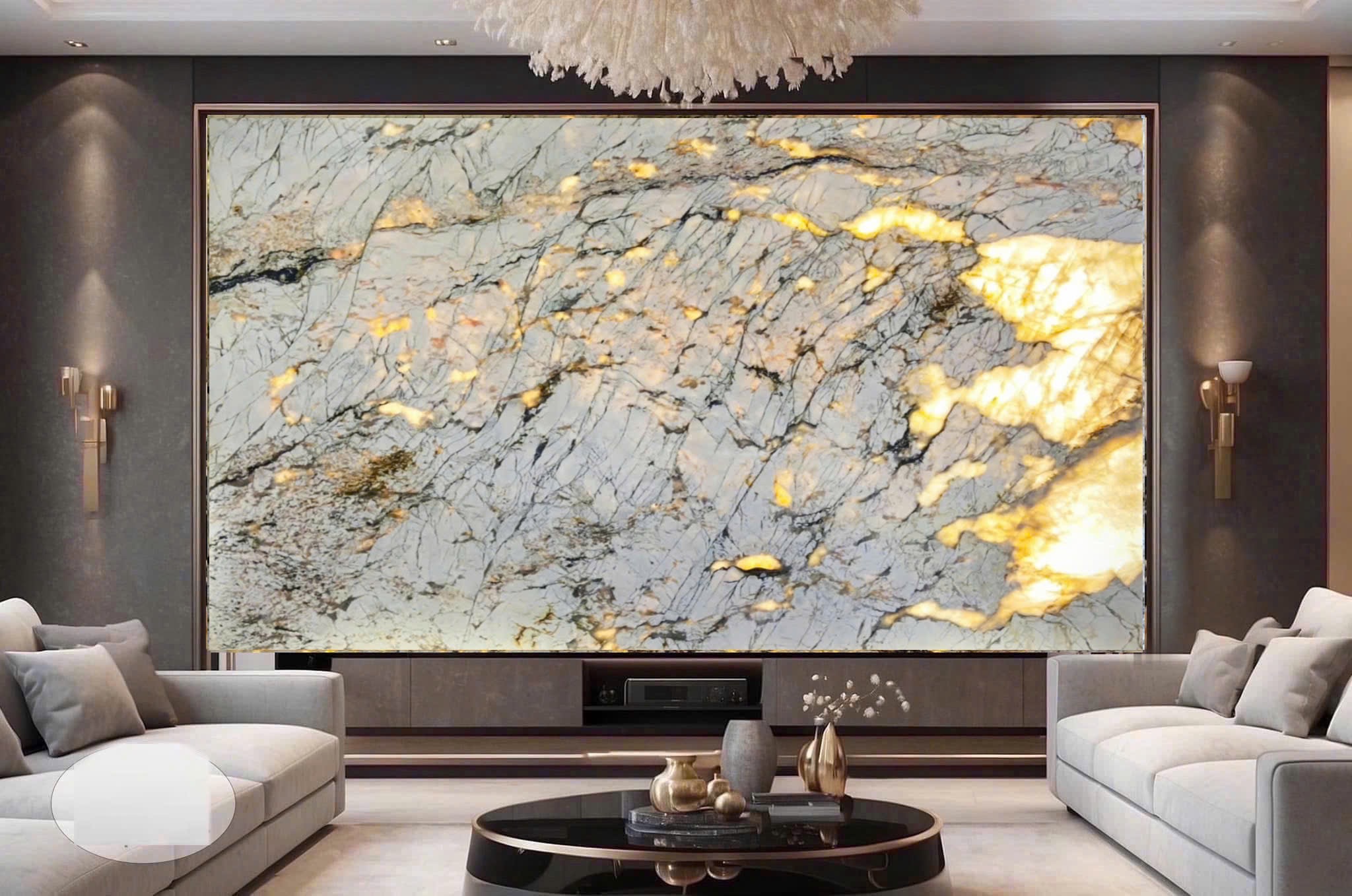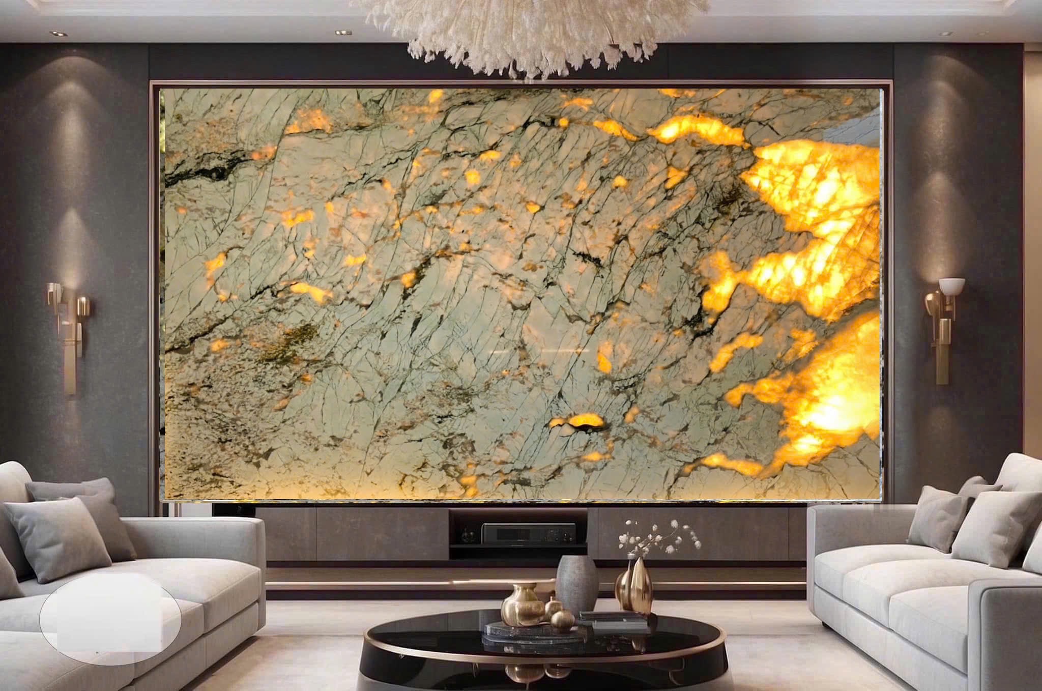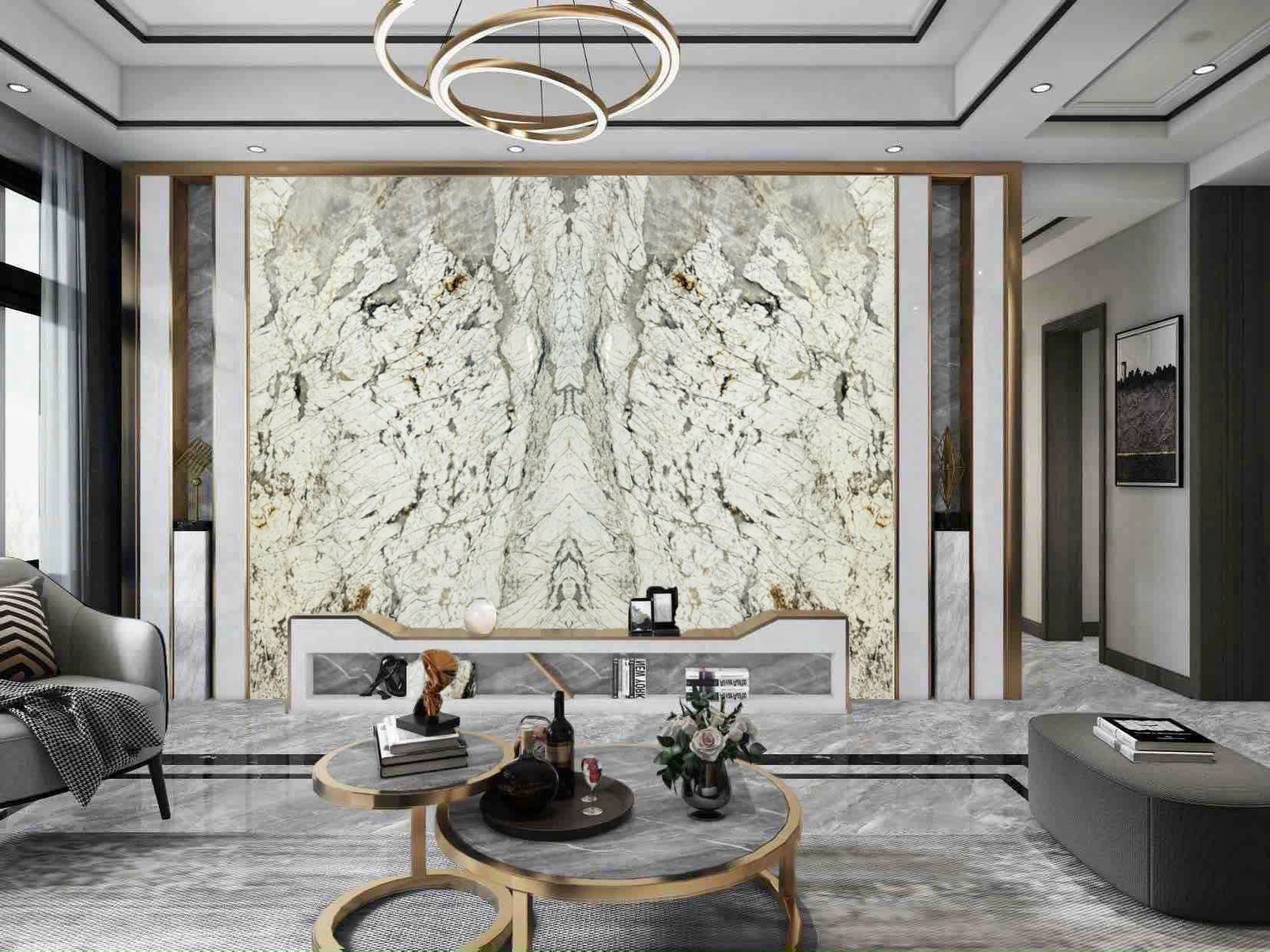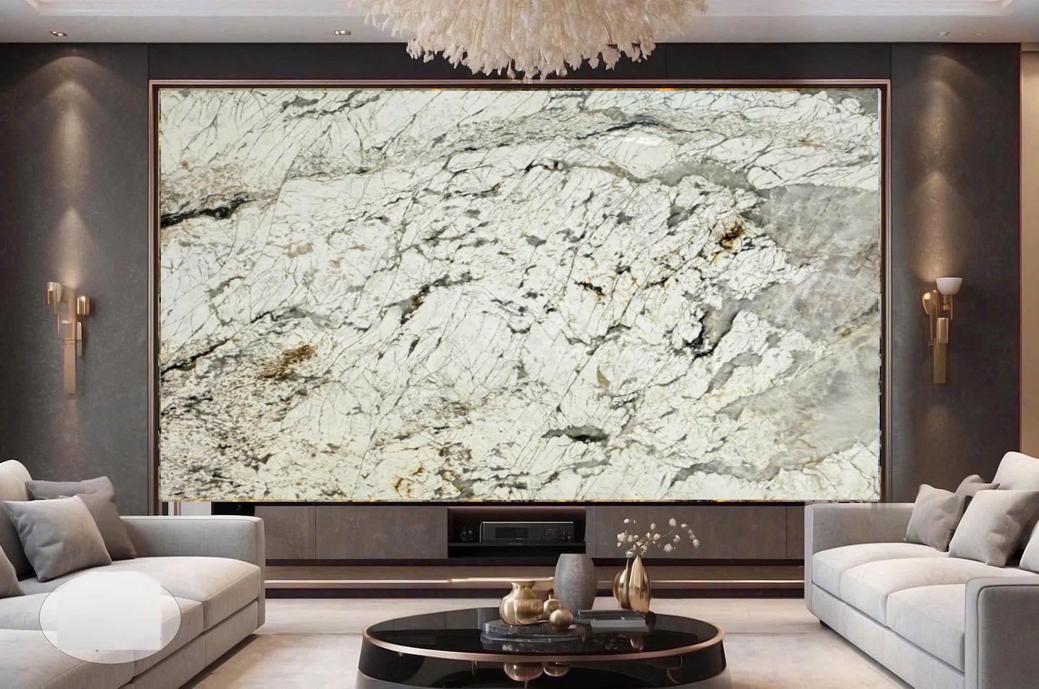 Vách TV với Monalisa White tạo nên không gian tối giản, hiện đại, giữ trọng tâm vào vẻ đẹp của từng đường vân đá. Màu trắng giúp tổng thể hài hòa với nhiều vật liệu nội thất.