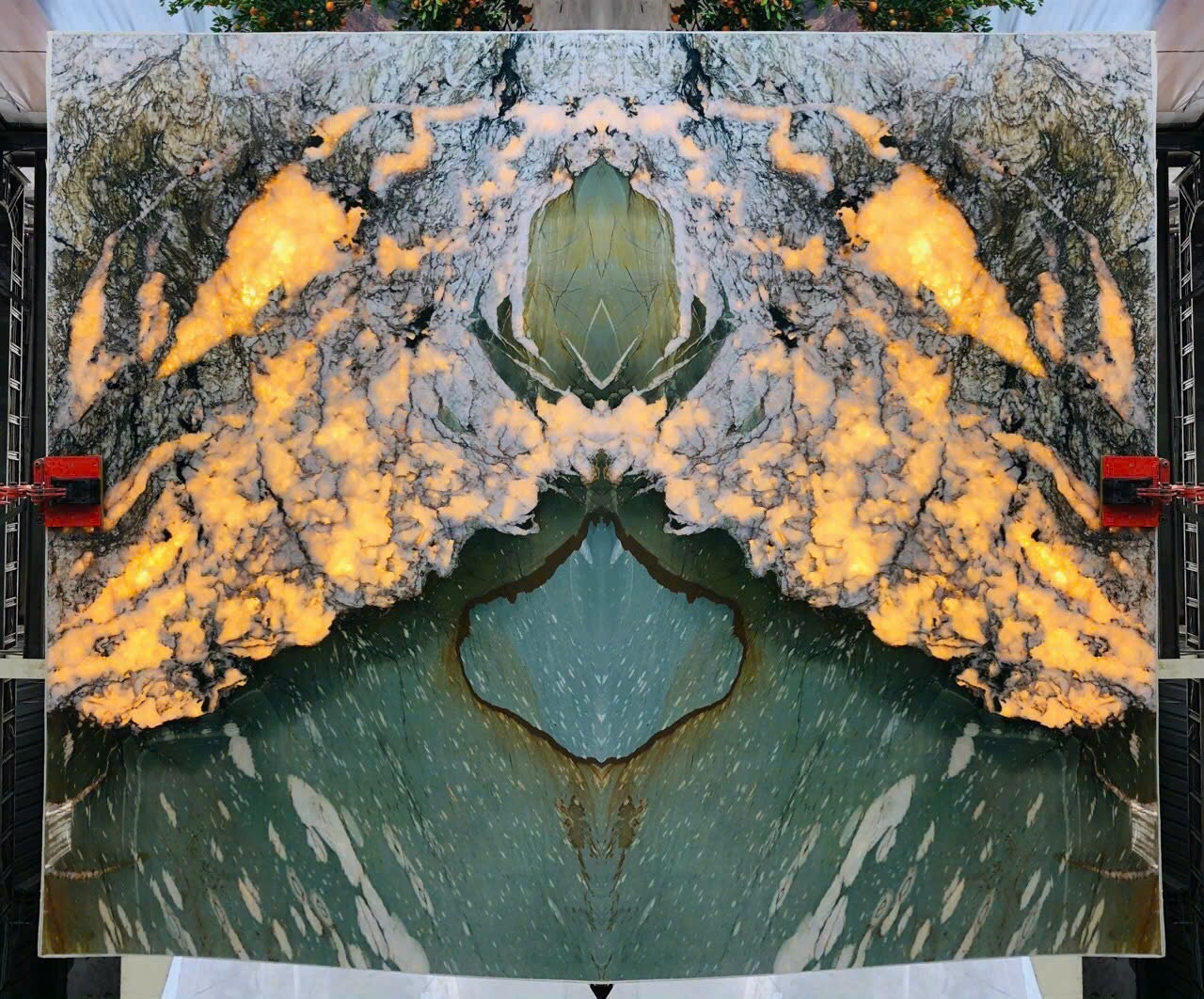 Sắc xanh của Phonix Green Patagonia hình thành từ các khoáng chất tự nhiên lắng đọng qua hàng triệu năm. Khi kết hợp cùng những mảng trắng, đen, vàng xen kẽ, tổng thể tấm đá trở nên hài hòa như một bức tranh phong cảnh trừu tượng.