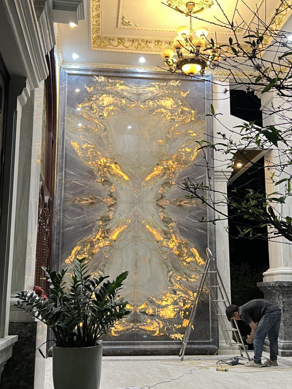 Đầu tiên phải kể đến đá Onyx – dòng đá quý với khả năng xuyên sáng độc đáo. Khi kết hợp ánh sáng đèn LED, bức tường sẽ trở nên lung linh, huyền ảo.